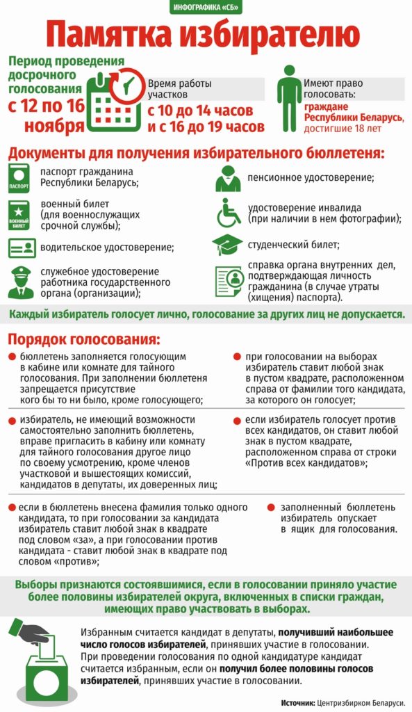 Участвовать в досрочном голосовании могут те белорусы, которые в основной день выборов не будут находиться по месту своего жительства. Никакого официального подтверждения невозможности прийти на избирательный участок 17 ноября не нужно.