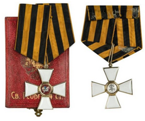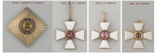 Звезда и знаки к ордену Св. Георгия Одни из первых кавалеров ордена Святого Георгия – участники морского сражения в Чесменской бухте, которое произошло в июне 1770 г. В этом сражении русская эскадра, под общим командованием графа Орлова А. Г.,полностью разгромила превосходящий по численности турецкий флот. За это сражение граф Орлов был пожалован орденом Св. Георгия первой степени и получил почетную приставку к своей фамилии «Чесменский». Первые медали на Георгиевской ленте были вручены в августе 1787, когда небольшой отряд под командованием Суворова отбил атаку превосходящего по численности турецкого десанта стремившегося захватить крепость Кинбурн. Суворов, находившийся в первых рядах сражавшихся и воодушевлявший их личным примером, в этом бою был дважды ранен, мужество российских солдат позволили разгромить турецкий десант. Впервые в российской истории медаль была вручена не всем участвовавшим в бою, ею были отмечены только те, кто проявил наибольшую личную храбрость и героизм. Причем решать, кто более достоин награждения, должны были именно солдаты, принимавшие непосредственное участие в военных действиях. В числе двадцати награжденных за этот бой был и гренадер Шлиссельбургского полка Степан Новиков, лично спасший Суворова от напавших на него янычар. Черно — оранжевые ленты были положены и для других медалей этой войны которые были вручены участникам героического штурма Очакова и отличившимся при взятие Измаила.