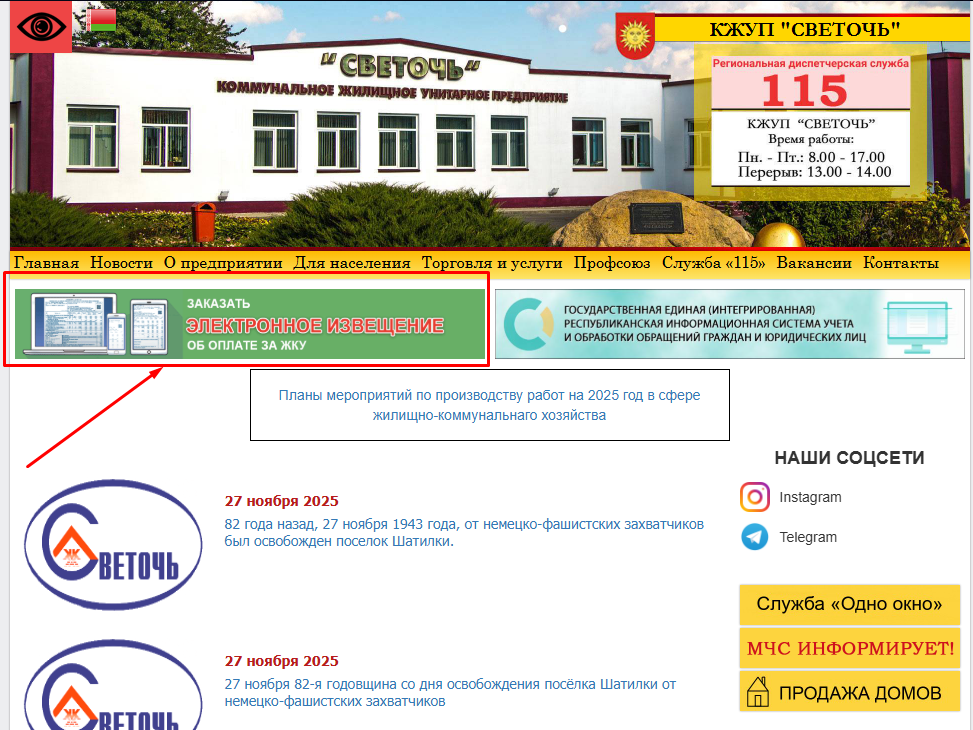 Заявку на получение извещений в электронном виде можно оформить на сайте КЖУП «Светочь» 28/11/2025 Комментарии отключены Общие Уважаемые работники ОАО «СДСК», извещение за коммунальные услуги можно получать в электронном виде. Заявку на получение извещений в электронном виде можно оформить на сайте КЖУП «Светочь» https://svsvetoch.by Прошлая новость Следующая новость