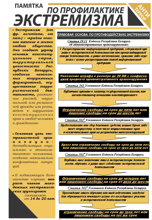 Экстремизм (от фр. exremisme, от лат.) – «крайне опасное явление в жизни любого общества. Оно создает угрозу основам конституционного строя, территориальной целостности Республики Беларусь, создание незаконных вооруженных формирований, осуществление террористической деятельности, разжигание расовой, национальной или религиозной вражды или розни, ведет к нарушению конституционных прав и свобод человека и гражданина».